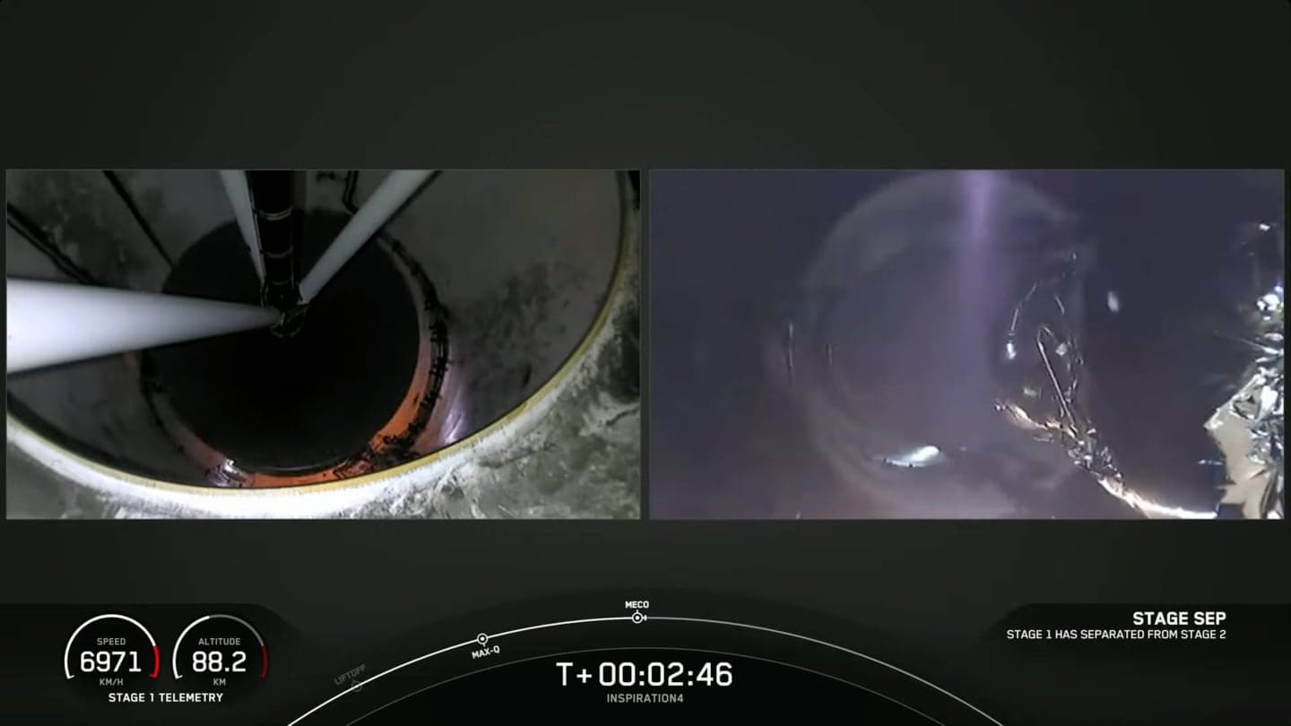 Po zhruba 12 minutách se oddělil druhý stupeň rakety a kapsle Crew Dragon se čtyřčlenou posádkou už mohla pokračovat na oběžné dráze zcela sama. Postupně vystoupala až do výšky 585 kilometrů, což je ještě dále, než je od Země vzdálená Mezinárodní vesmírná stanice (ISS). A je to mnohonásobně dál, než kam se podívali v létě miliardáři Richard Branson a Jeff Bezos, které Musk poměrně slušně zahanbil.